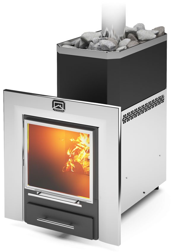 Конструкция топки обеспечивает равномерное нагревание воздуха и камней. Печь оснащена многосекционным скоростным парообразователем для получения высокодисперсного пара уже через 30 минут после растопки печи. Дверца топки со стеклом диагональю 17 дюймов. Нагрев воды возможен установкой бака на трубе или теплообменника (регистра) соединенного с баком для регистра.