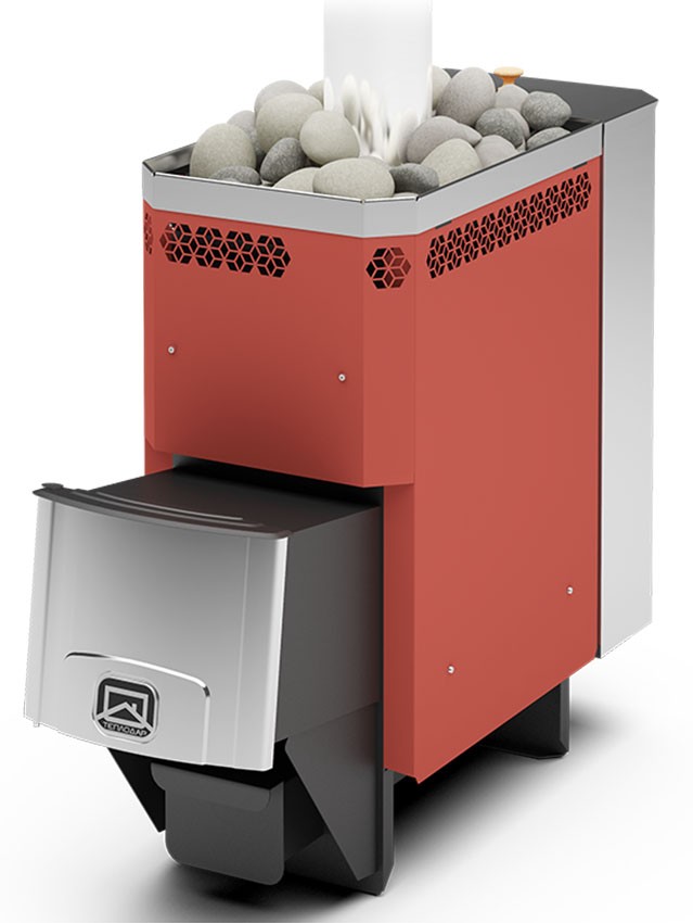 Кожух-конвектор охватывающий топку создает мощные конвекционные потоки и нагревает парилку. Каменка печи двухсекционная, камни контактируют с максимальным количеством нагретых металлических поверхностей, что позволяет нагреть камни до температуры в 500 градусов. Расположение дымохода верхнее центральное. Данная модель печи комплектуется навесным баком на 33 литра. Камни и дымоход в комплектацию печи не входят.