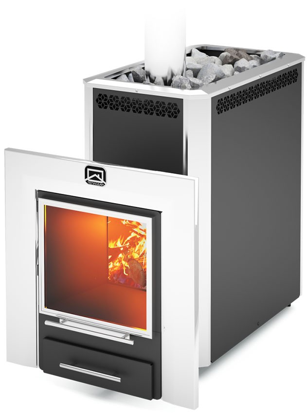 Дымоход расположен сверху и смещен к передней стенке для максимального доступа к камням каменки. Отличительная особенность конструкции печи позволяет нагреть парную до 100 градусов за рекордные 30 минут, и получить сухой пар с влажностью воздуха 5-30%. Дверца с термостойким стеклом, диагональ которого 43 см., позволяет наслаждаться горением дров в топке банной печи из комнаты отдыха. Защелка дверцы топки магнитная.