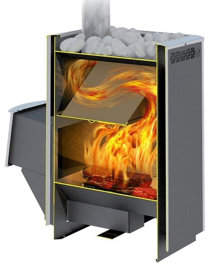Дымоход расположен сверху и смещен к передней стенке для максимального доступа к камням каменки. Отличительная особенность конструкции печи позволяет нагреть парную до 100 градусов за рекордные 30 минут, и получить сухой пар с влажностью воздуха 5-30%. Бак для воды, камни и дымоход в комплектацию печи не входят.