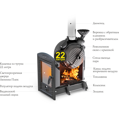 Печь «Чёрная жемчужина Люмина Плюс Cast» — это не просто отопительный прибор, а настоящая жемчужина в мире банного искусства, созданная для ценителей настоящего пара и долгого, мягкого жара. Её главное сокровище — массивная и продуманная каменка, которая станет залогом идеальной бани.