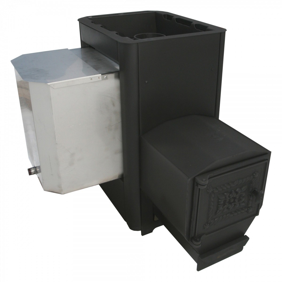 Печь для бани Варвара "Мини" навесная удлинённая топка представляет собой печь для бань и саун со встроенным баком для нагрева воды. Для удобства размещения бак может располагаться как справа, так и слева. Бак навешивается в специальный карман (либо справа, либо слева) на боковой стенке печи. Нагрев воды в баке осуществляется за счет передачи тепла от одной из стенок печи. Навесной бак всегда можно снять и промыть, ведь не секрет, что на внутренней поверхности бака будет образовываться налет. Имеет компактные размеры, что дает ей возможность быть установленной в небольших помещениях. В печи сохранена система двойной конвекции, что позволяет ей, быстро прогревать парилку и каменку печи.