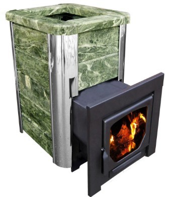 Печь для бани Варвара "Мини Сказка" облицовка змеевик удлинённая топка сочетает в себе привлекательный внешний вид и эффективную конвекционно-аккумулирующую печь, способную за короткое время прогреть помещение и оставить его теплым в течении длительного времени. Стенки и верх печи сделаны из камня талькохлорит. Дверь с панорамным жаропрочным стеклом позволяет насладиться необыкновенной и красочной игрой огня. Привлекательный внешний вид. Горение происходит по всей длине топки.