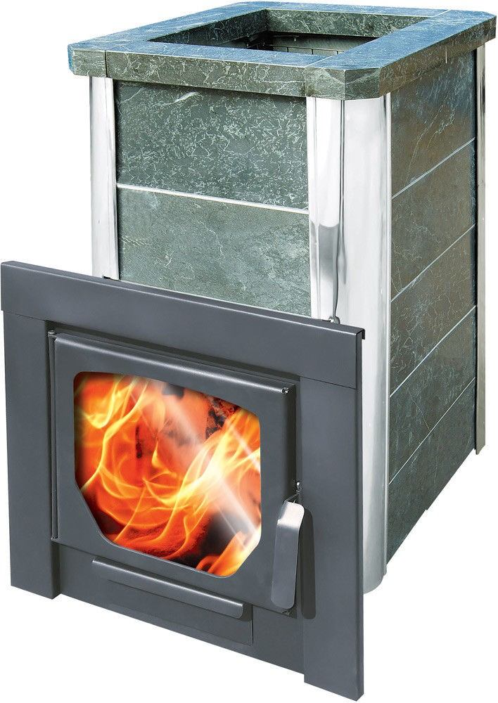 Печь для бани Варвара "Сказка" облицовка талькохлорит удлиненная топка сочетает в себе привлекательный внешний вид и эффективную конвекционно-аккумулирующую печь, способную за короткое время прогреть помещение и оставить его теплым в течении длительного времени. Стенки и верх печи сделаны из камня талькохлорит. Дверь с панорамным жаропрочным стеклом позволяет насладиться необыкновенной и красочной игрой огня. Привлекательный внешний вид. Горение происходит по всей длине топки.