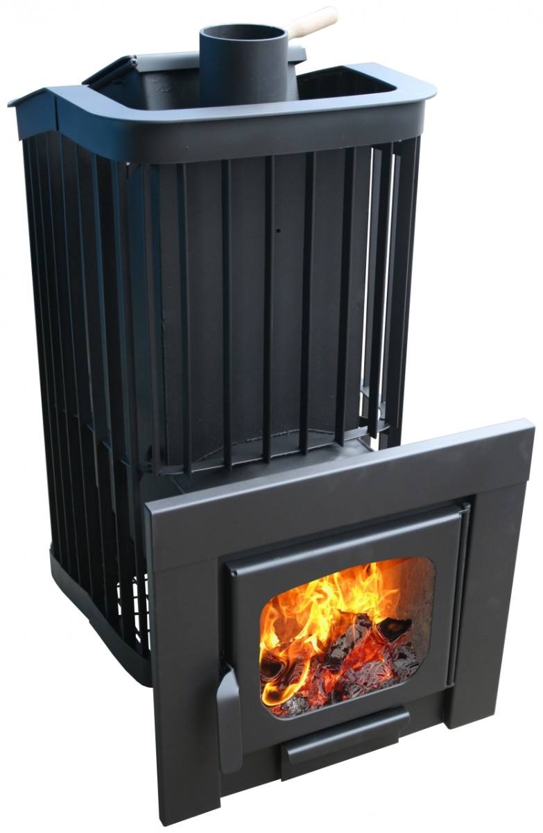 Печь для бани Варвара "Терма Каменка Мини" панорамная дверь с сетчатым кожухом для закладки камнем и закрытой каменкой. Камни в данной модели закладывается в специальный карман с дверцей, находящийся внутри печи. При топке камень в данной модели нагревается до более высокой температуры в отличии от моделей с открытой каменкой. Такая модификация дает возможность получить мягкий мелкодисперсный пар. Также имеется сетчатый кожух для закладки камней снаружи, для большей теплоотдачи и для уменьшения инфракрасных лучей от металла печи. Общий объем закладываемых камней до 160 кг.