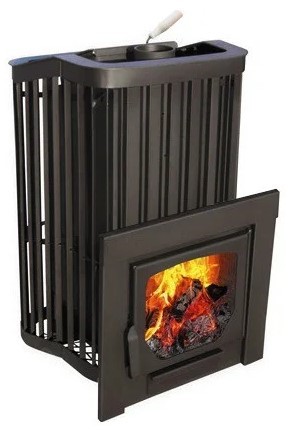 Печь для бани Варвара "Терма Каменка" панорамная дверь укороченная топка с сетчатым кожухом для закладки камней и закрытой каменкой. Камни в данной модели закладывается в специальный карман с дверцей, находящийся внутри печи. При топке, камень в данной модели нагревается до более высокой температуры, в отличии от моделей с открытой каменкой. Такая модификация дает возможность получить мягкий мелкодисперсный пар. Также имеется сетчатый кожух для закладки камней снаружи, для большей теплоотдачи и для уменьшения инфракрасных лучей от металла печи.