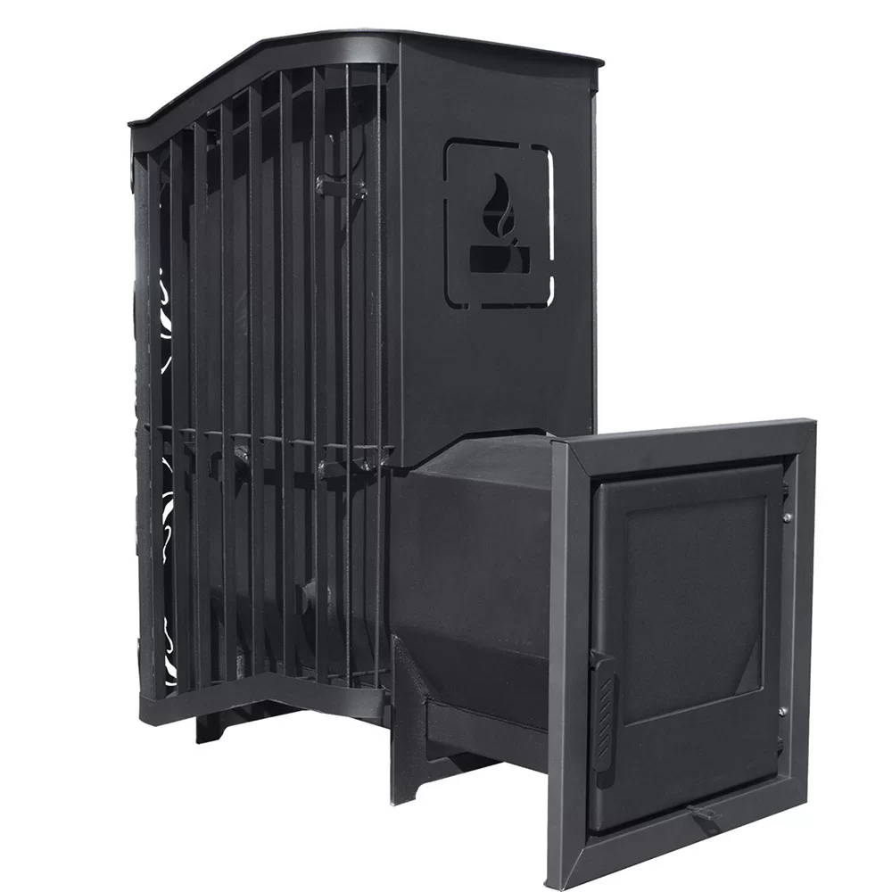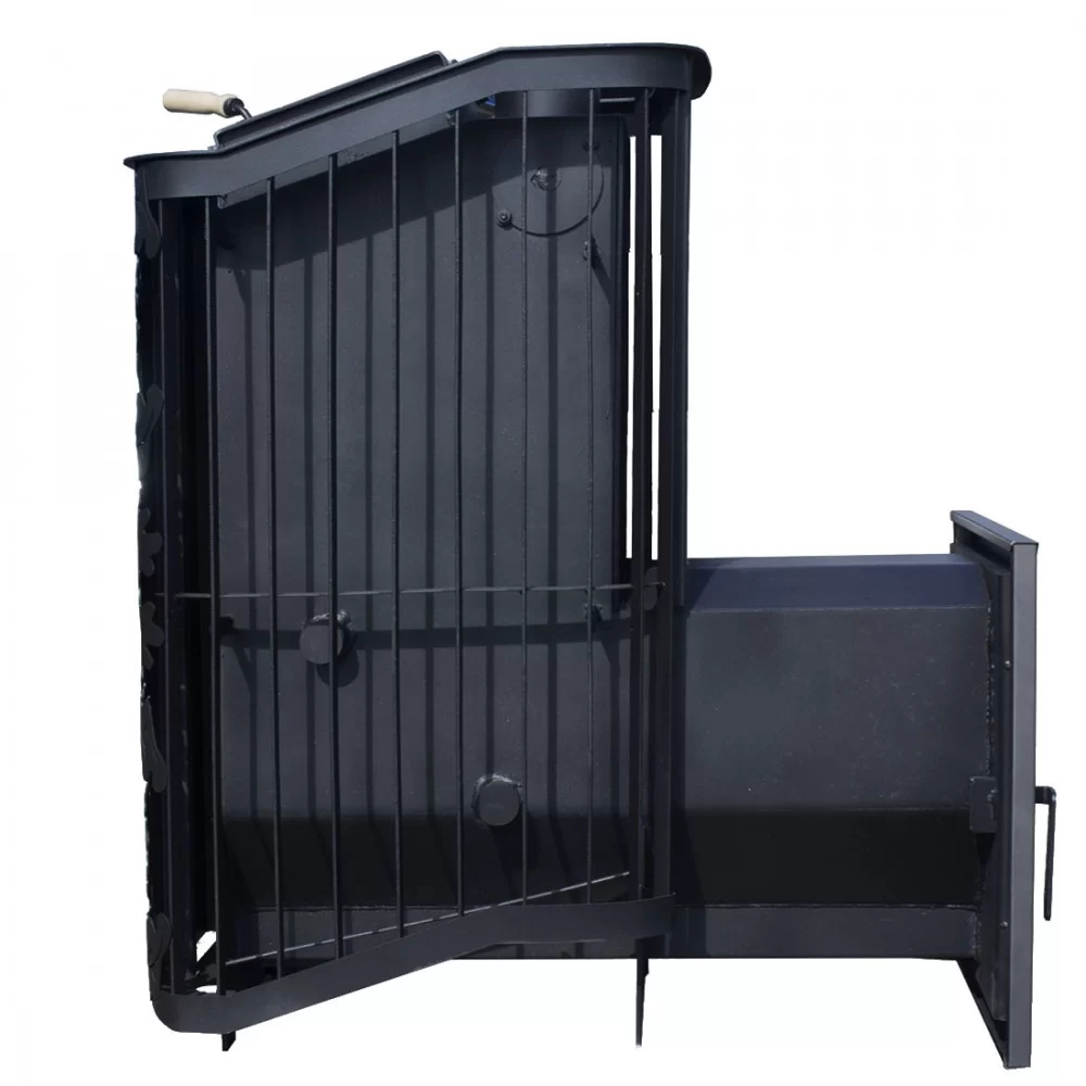 Печь для бани Варвара "Терма Каменка" удлиненная топка с сетчатым кожухом для закладки камнем и закрытой каменкой. Камни в данной модели закладывается в специальный карман с дверцей, находящийся внутри печи. При топке, камень в данной модели нагревается до более высокой температуры, в отличии от моделей с открытой каменкой. Такая модификация дает возможность получить мягкий мелкодисперсный пар. Также имеется сетчатый кожух для закладки камней снаружи, для большей теплоотдачи и для уменьшения инфракрасных лучей от металла печи.