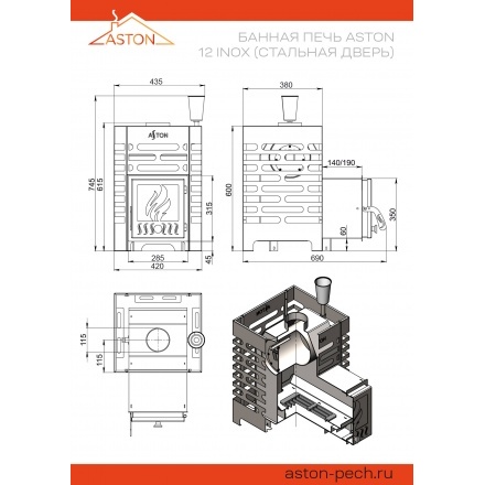 Печь для бани ASTON 12 INOX. Преимущество печи для бани ASTON 12 INOX в том, что топка печи состоит из 3-х элементов. Печь комплектуется дожигателем, чугунным колосником и зольным ящиком, что обеспечивает полное прогорание всех дров и углей. В дверце печи встроен регулятор подачи воздуха в виде винта. Кожух печи разъемный, что делает его удобным для транспортировки и монтажа.