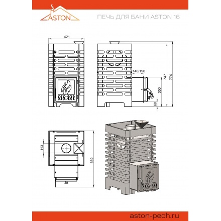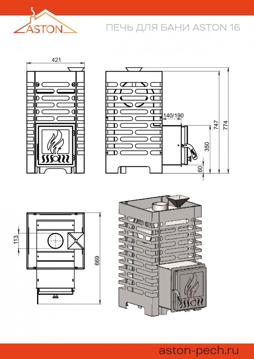 Преимущество печи для бани ASTON 16 в том, что топка печи состоит из 3-х элементов. Печь комплектуется дожигателем, чугунным колосником и зольным ящиком, что обеспечивает полное прогорание всех дров и углей. В дверце печи встроен регулятор подачи воздуха в виде винта. Кожух печи разъемный, что делает его удобным для транспортировки и монтажа. Парогенератор в комплект поставки печи не входит!