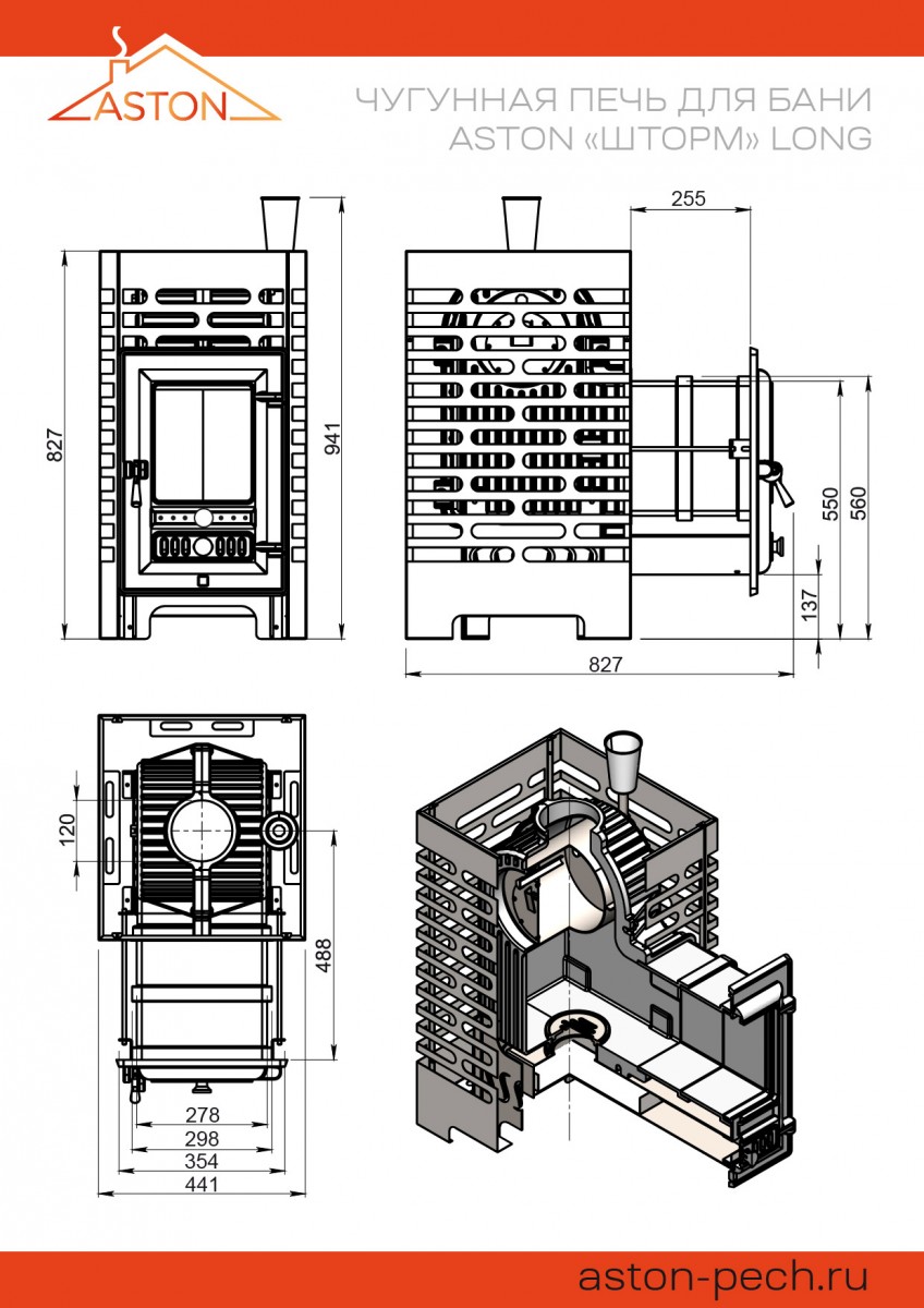 Банная печь ASTON Шторм Long со стеклянной дверцей мощность 18 кВт, для парной 12-20 м3, чугунная топка, гарантия 1 год.