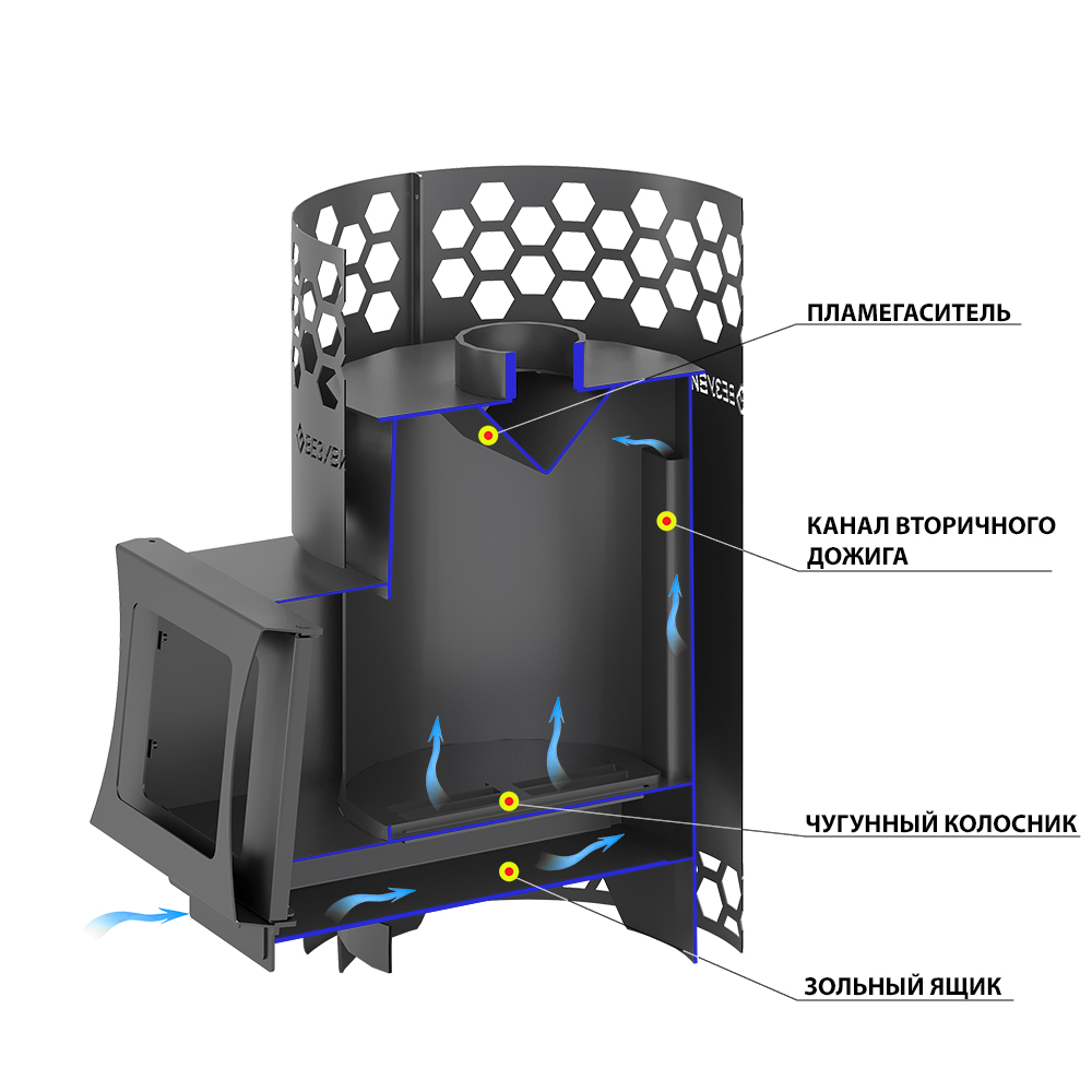 Печь сделана из особо прочной котловой стали марки 09Г2С с толщиной стенок от 3 до 4 мм. Дизайн корпуса печи выполнен в виде сот. Диаметр дымохода 115 мм. Дверка имеет правое и левое открытие. Улучшенная загрузка дров благодаря расположению двери под углом. Печи представлены как со стеклом, так и без него. Так же есть возможность дополнить печь баком на 50 литров, подиумом высотой в 70 мм и фронтальным экраном.