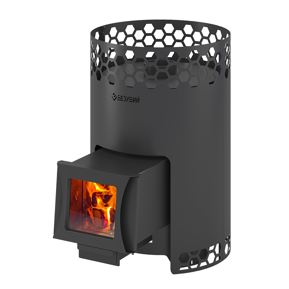 Печь для бани Везувий Черная Пчелка 20 С, котловая сталь, тип каменки: открытая, объём парного помещения: от 12 до 20 м3, с выносом, со стеклом