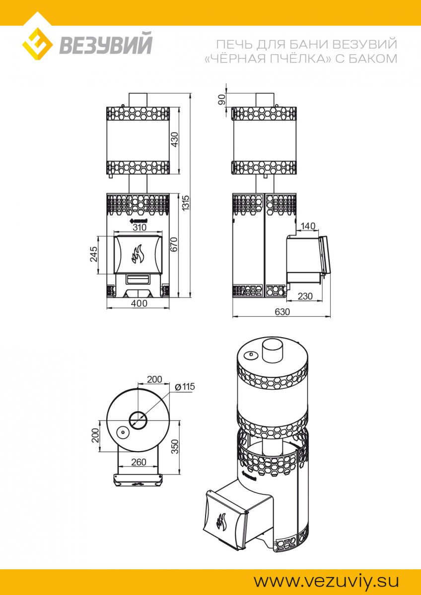 Печь для бани Везувий Черная Пчелка с баком для воды, Каменка: открытая; Максимальный объем отапливаемого помещения: 14 м³, Тип топки: выносная, Материал печи и топки: сталь.