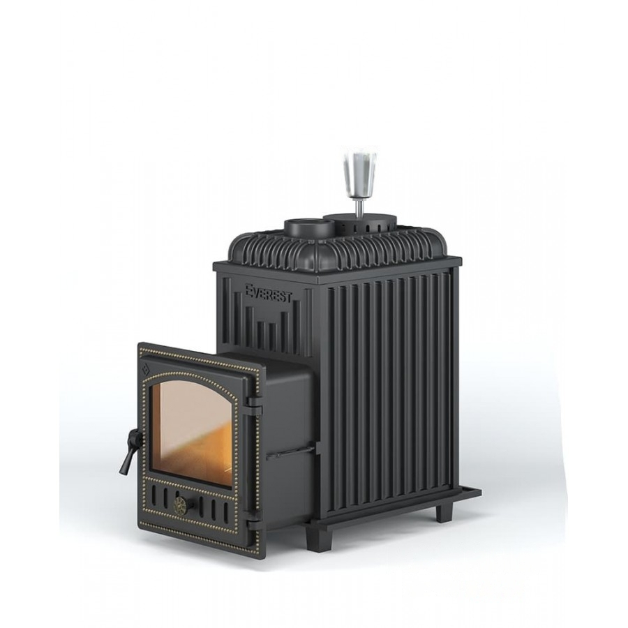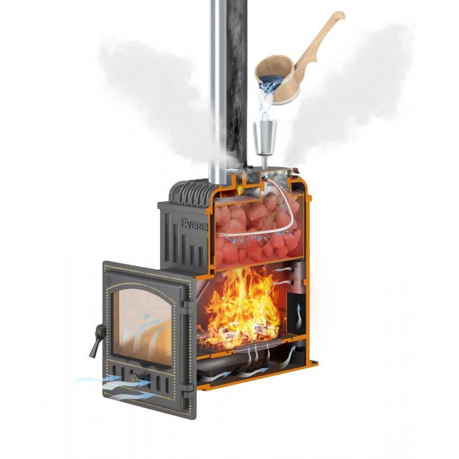 Чугунная печь для бани «Эверест Лёгкий Пар» рассчитана на использование в парных помещениях объёмом до 26м3. Печь идеально подходит для создания температурного режима «русская баня». Печь «Эверест Лёгкий Пар» имеет сборную конструкцию, лишена дополнительных сварных и резьбовых соединений, сборка печи выполнена по системе «выступ-паз». Топка банной печи «Эверест Лёгкий Пар» изготовлена из высококачественного жаростойкого чугуна. На месте пламегасителя в верхней части топки размещена закрытая каменка из нержавеющей стали толщиной 3 миллиметра. Объём каменки рассчитан на 30-40 килограммов камней.