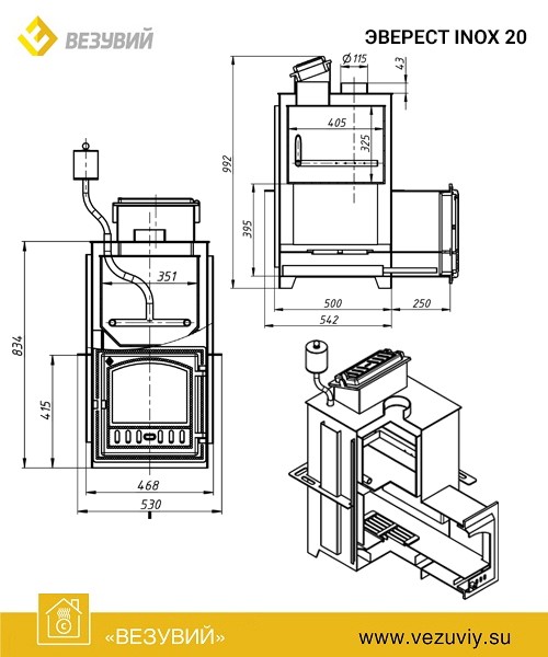Печи Эверест INOX 20 рассчитаны на объём парной от 18 до 24 кубических метров. Печи INOX изготовлены из нержавеющей стали марки AISI 430, толщиной от 4 до 6 мм. Более толстая сталь идёт на изготовление закрытой каменки, а топочная часть печи сделана из стали толщиной 4 мм. Из такой же стали сделан топочный тоннель всех трёх моделей. Ключевым элементом печей INOX является закрытая каменка, размещённая над топочным пространством. Толстые стенки каменки выполняют функцию зуба-отбойника. Пламя и нагретые газы обтекают каменку с пяти сторон, позволяя быстро нагревать закладываемые вовнутрь камни до температуры 550-600 градусов. Вода из верхней ёмкости по трубкам поступает в нижнюю часть каменки и через точечные отверстия равномерно попадает на камни. Система позволяет получать мелкодисперсный пар без чрезмерного остывания камней. Для выхода пара в верхней части каменки оборудована дверка. Система регулирования воздушного потока чугунной дверки помогает чётко дозировать количество пара, выходящего из каменки.