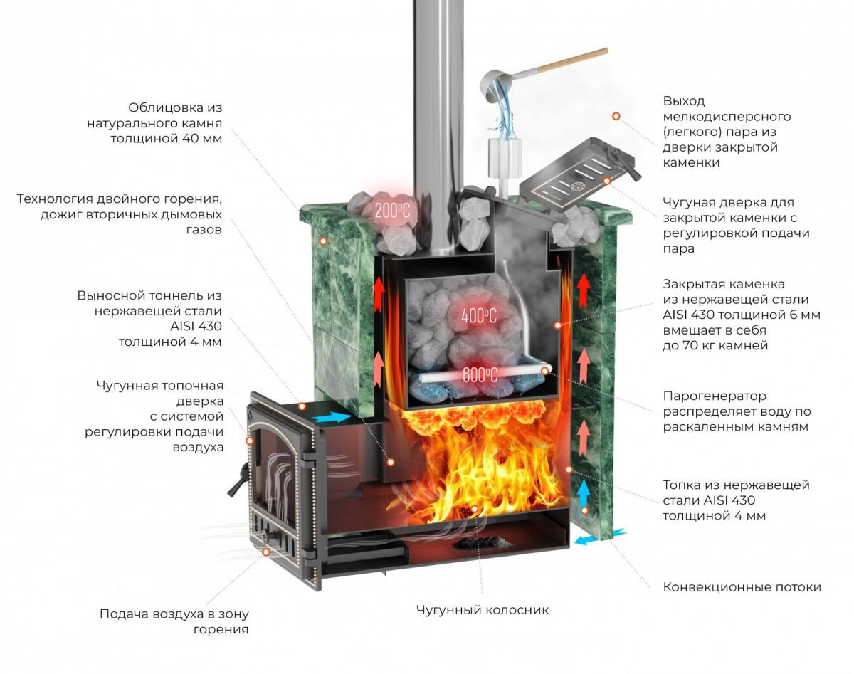 Система позволяет получать мелкодисперсный пар без чрезмерного остывания камней. Для выхода пара в верхней части каменки оборудована дверка. Система регулирования воздушного потока чугунной дверки помогает чётко дозировать количество пара, выходящего из каменки.