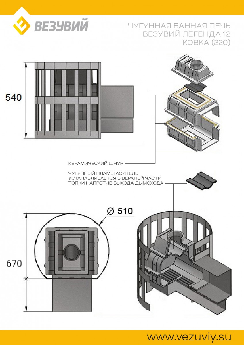 Печь для бани Везувий Легенда Ковка 12 рассчитана на парное отделение объемом от 6 до 14 м3. Преимущество печи в том, что топка печи состоит из 3-х элементов. На стыке между ними используется керамический шнур с рабочей температурой 1200 градусов. То есть топка печи абсолютно герметична! Для фиксации деталей между собой применяется болтовое соединение, что даёт 100% гарантию безопасности при эксплуатации.