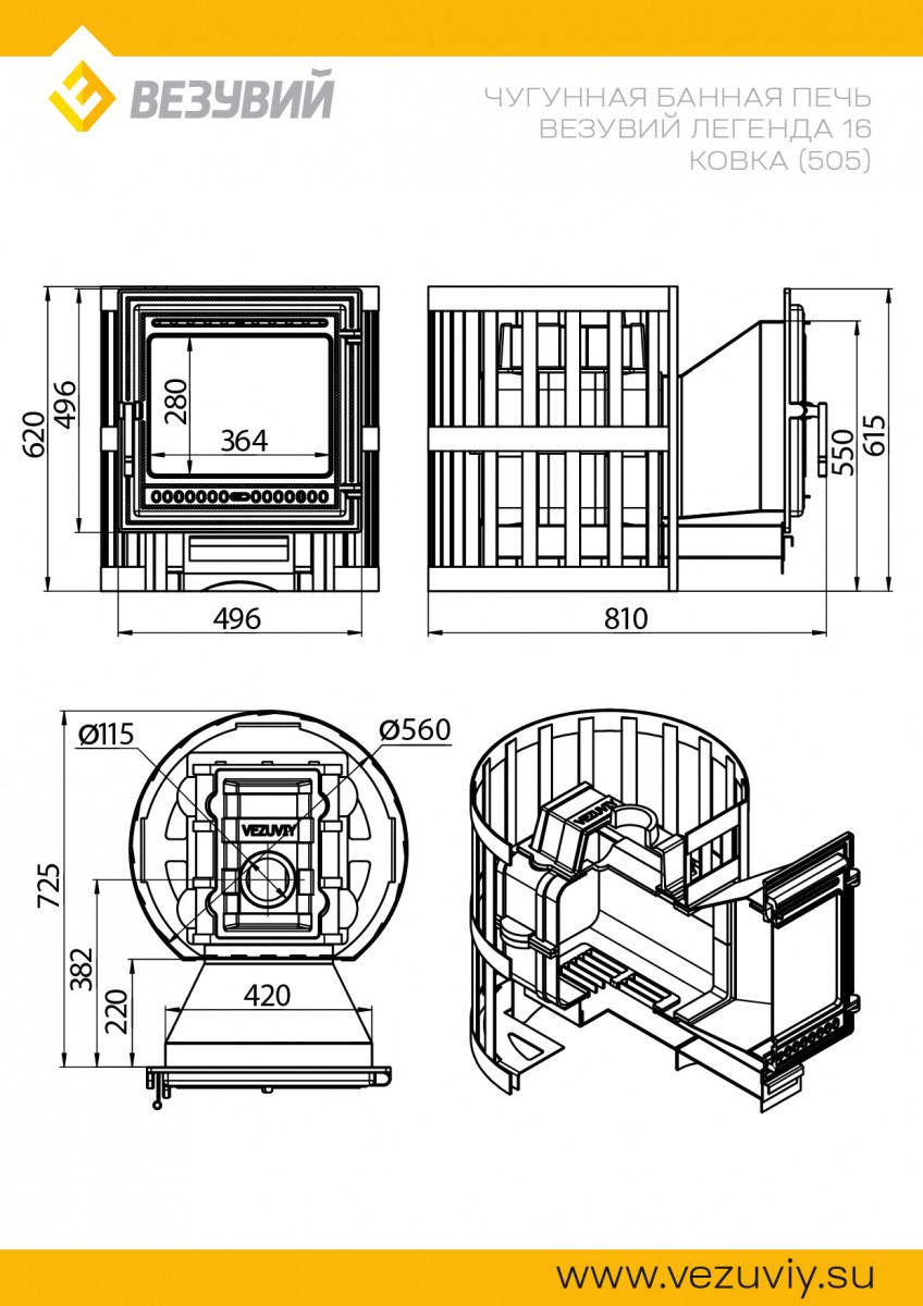Банная печь Везувий Легенда Ковка 16 (505) для парной объёмом до 18 м3, жаростойкий чугун 8 мм