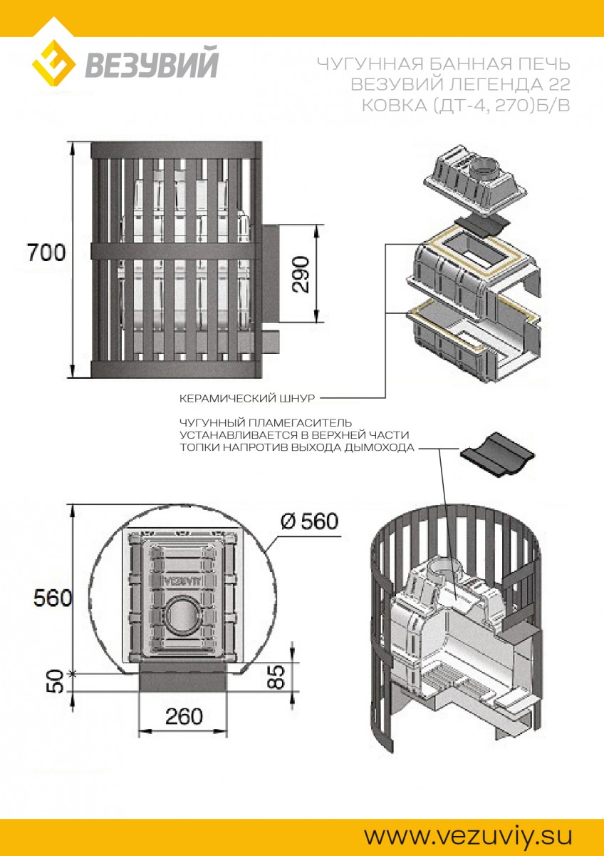 Печь для бани Везувий Легенда Ковка 22 (270) без выносной топки - чугунная печь для бани со стальной кованой сеткой для камней. Топка печи выполнена из двух отлитых частей стянута болтами, для герметичности соединения применяется уплотнительный шнур с рабочей температурой в 1200°C. В топке предусмотрен съемный чугунный зуб-отбойник для поворота пламени и увеличения КПД печи. Съемный отбойник пламени облегчает периодическую чистку печи от сажи. Снаружи на печь одевается стальная сетка в которую закладываются камни. Большая масса камней позволяет надолго сохранять тепло и защищает от сильного инфракрасного излучения идущего от наружной стенки топки. Печь протапливается из парного помещения бани (укороченная топка).