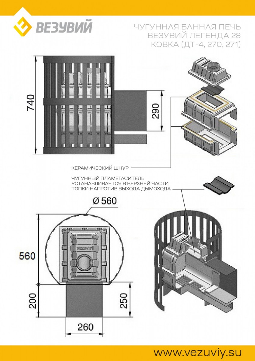 Печь для бани Везувий Легенда Ковка 28 рассчитана на парное отделение объемом от 14 до 30 м3. Преимущество печи в том, что топка печи состоит из 3-х элементов. На стыке между ними используется керамический шнур с рабочей температурой 1200 градусов. То есть топка печи абсолютно герметична! Для фиксации деталей между собой применяется болтовое соединение, что даёт 100% гарантию безопасности при эксплуатации.