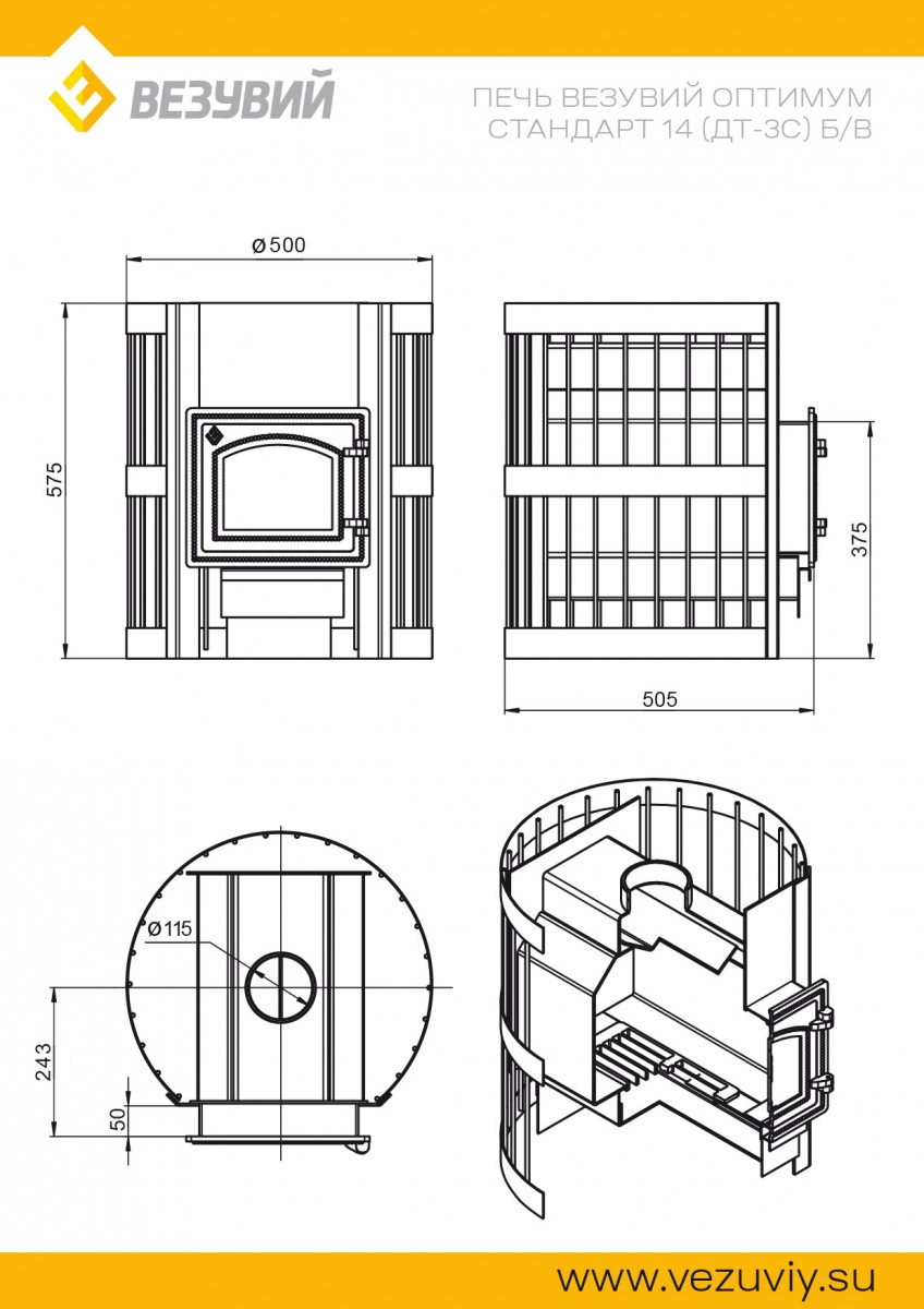 Дровяная банная печь Везувий Оптимум Стандарт 14 (ДТ-3С) со стеклом без выноса, Каменка: открытая; Максимальный объем отапливаемого помещения: 14 м³, Материал печи и топки: сталь, Габариты (ШхГхВ): 500x600x580 мм.