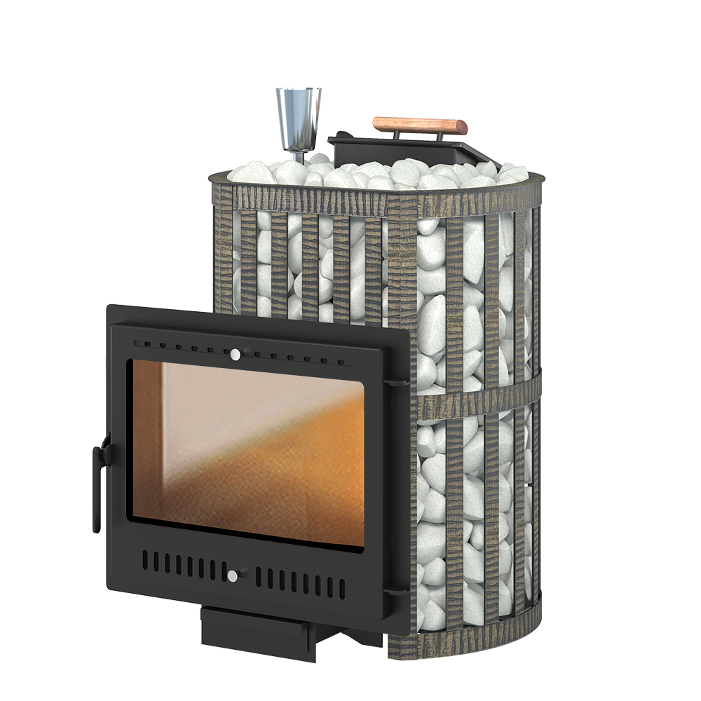 Закрытая каменка изготовлена из стали. Конвекционно-вентилируемый кожух "Ковка" изготовлен из металлической текстурированной полосы, окрашен термостойкой краской и покрыт патиной «Бронза».