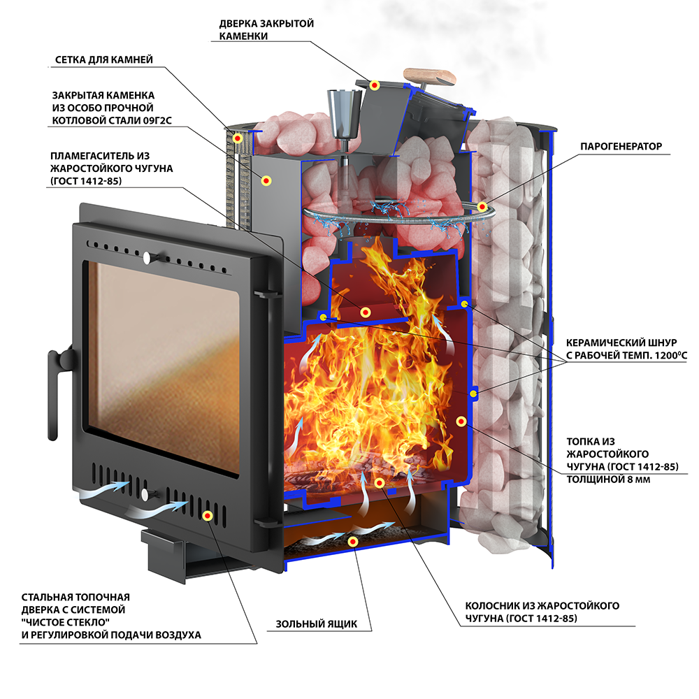 | Материал закрытой каменки | особо прочная котловая сталь (09Г2С) |