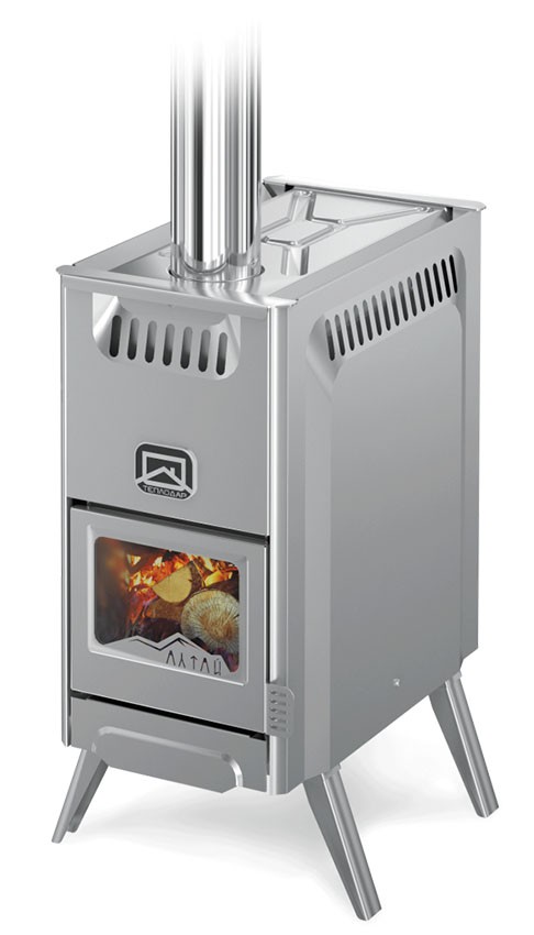 Печь комплектуется ножками, дверцей с термостойким стеклом, модульным дымоходом, а также в комплекте поставляется сумка для транспортировки. Мобильная печь "Алтай" нагревает воздух по конвекционному принципу, камни не используются. Готовность мобильной бани (80-100 градусов) с использованием палатки "Теплодар" 10-20 минут.