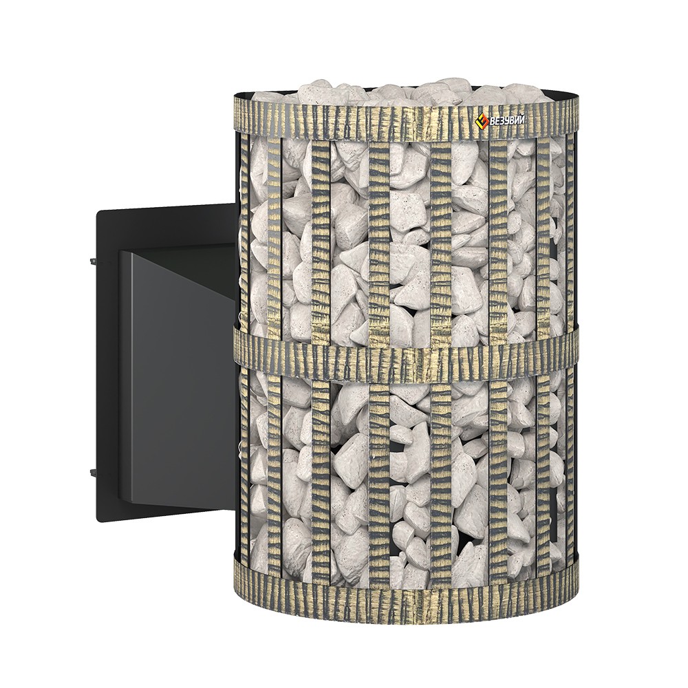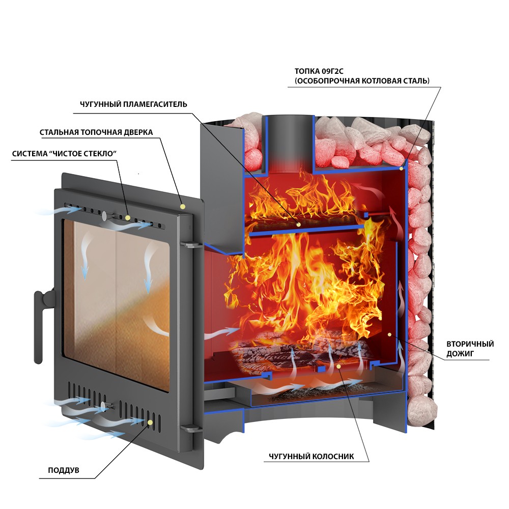 Чугунный пламегаситель перенаправляет поток горячего воздуха и дымовых газов к задней части топки. Это позволяет снять с печи максимум энергии в единицу времени. Чугунная дверь при нагревании не деформируется, сохраняет свою форму при остывании и предотвращает попадание продуктов горения на пол перед топкой. Печи Везувий СКИФ оснащаются сетками для камней. Сетки могут быть сделаны из металлического прутка или кованой стальной ленты шириной 40 мм. В сетки по всей высоте укладываются камни для бани, обеспечивая большой объём заклада и длительное удержание тепла после прогрева каменки.