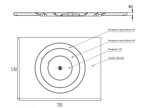 Толщина металла в этих местах увеличивается почти вдвое, до 18 мм. Конфорки на усиленной плите под казан Везувий ПК-430 так же изготовлены с усилением. Рёбра жёсткости на их нижней поверхности хорошо распределяют тепло и способствуют эффективному нагреву конфорок. Плита усиленная под казан рассчитана на посуду диаметром до 43 см, при полностью снятых конфорках в неё удобно встаёт 12 л казан Везувий. Посуда меньшей размерности устанавливается за счёт снятия меньших конфорок. Плита усиленная под казан Везувий ПК-430 изготовлена из качественного чугуна, который разрешён к применению в пищевой промышленности.