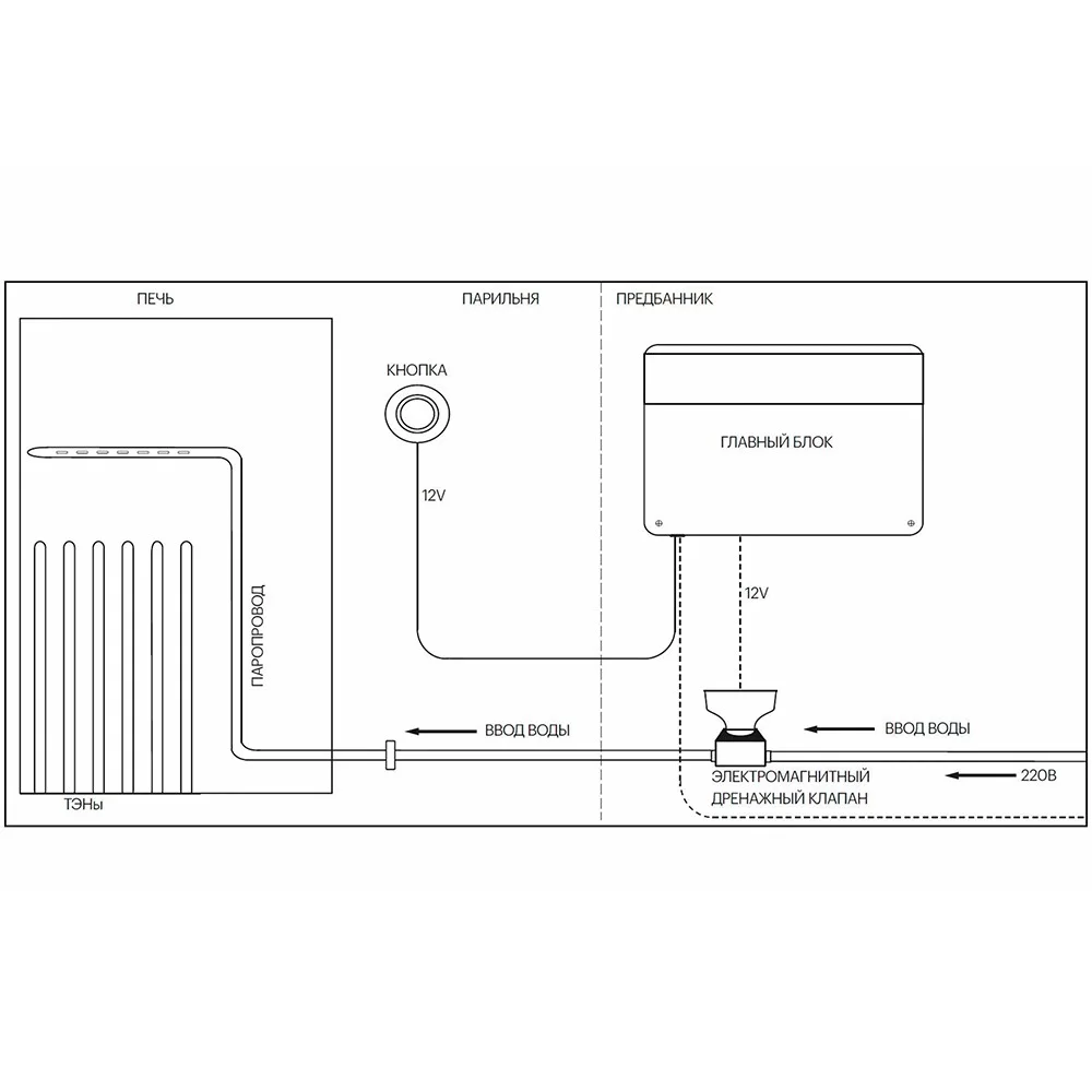 Автоматическая система подачи пара BORN® steamboost предназначена для безопасной подачи воды в каменку и предохранения от ожогов путем дозированной подачи через низковольтный ( 12V) электромагнитный клапан на паропровод, находящийся внутри каменки.