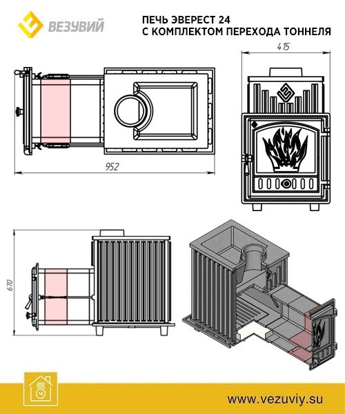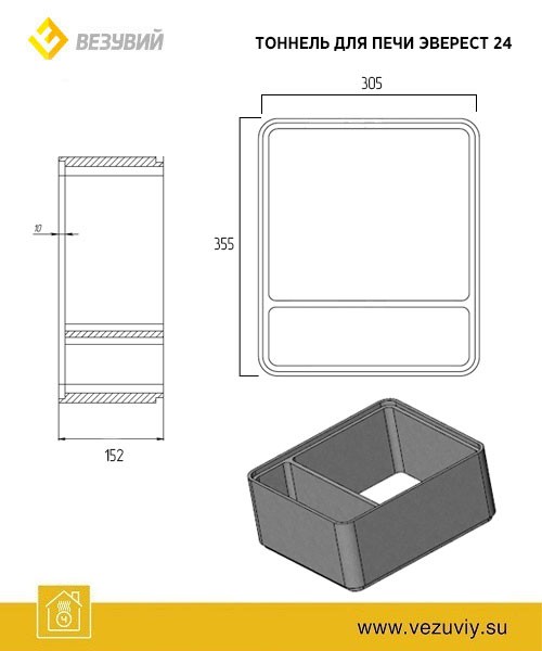 Тоннель Эверест 24 предназначен для увеличения длины топочного тоннеля в случае, если толщина стены превышает 20 сантиметров. Рабочая длина изделия составляет 130 миллиметров. Конструктивно удлинитель повторяет штатный тоннель печи Эверест, с узким нижним поддувальным тоннелем и полноразмерным верхним топочным тоннелем.