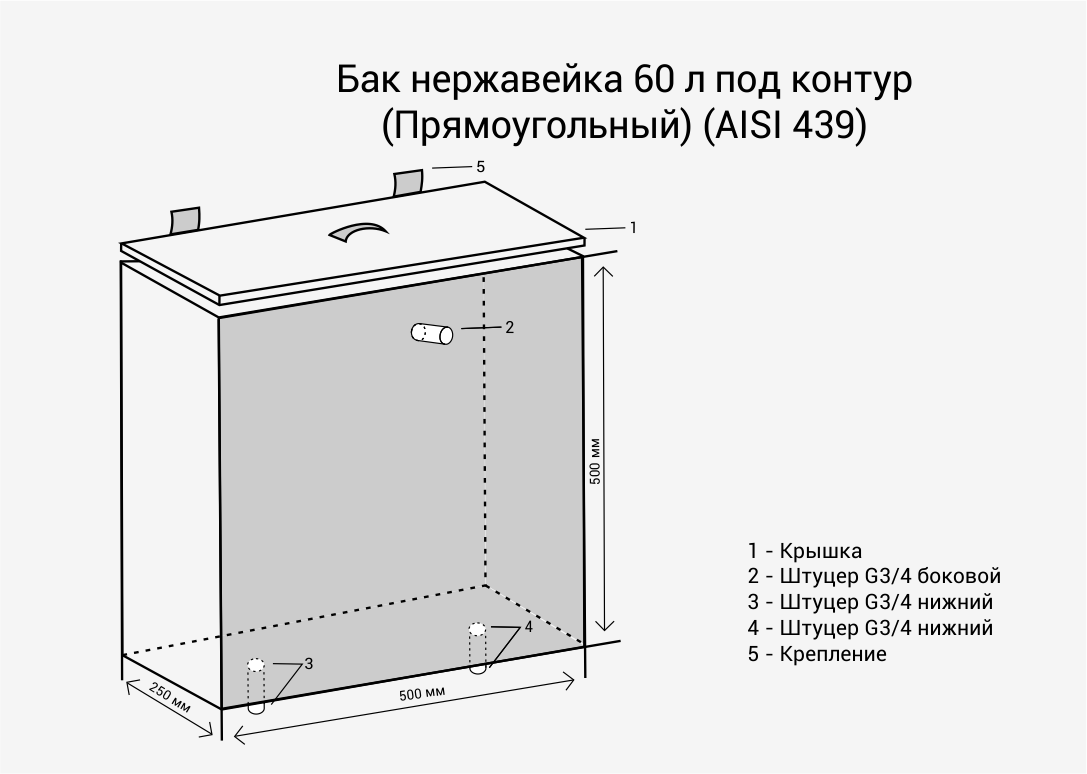 Бак Везувий нержавеющий 60 л (под контур) прямоуг. представляет собой прямоугольную ёмкость из матовой нержавеющей стали толщиной 1 мм, предназначенную для хранения холодной и горячей воды в индивидуальных банных и жилых помещениях. Устройство баков несложное: сверху имеется заливная горловина, в дне и по бокам – штуцера G3/4, посредством которого вода может сливаться, заливаться и переливаться в случаи необходимости. Бак имеет индивидуальное крепление, с помощью которого может быть установлен на стену.