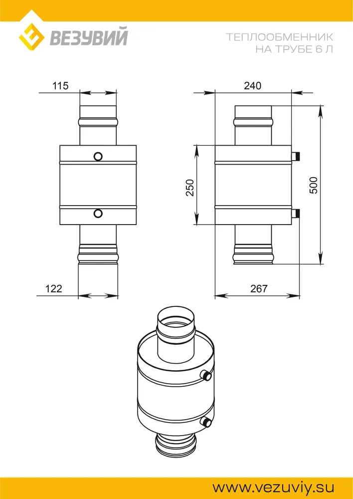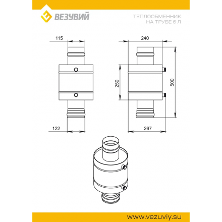 Теплообменник Везувий 6 л на трубе д. 115 представляет собой герметичную ёмкость из нержавеющей стали, предназначенную для нагрева воды в смежных помещениях, используя тепло получаемого от сжигания в печи твёрдого топлива. Теплообменники имеют два штуцера G3/4 для присоединения к системе водоснабжения или к системе отопления.