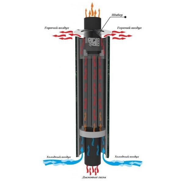 Обеспечивает конвекцию воздуха в парильном помещении, тем самым помогает прогреву парной. Встроенные каналы распределяют потоки воздуха, забирая холодный воздух в нижней части дымохода, нагревая его и отдавая в верхней части с помощью регулятора конвекции.