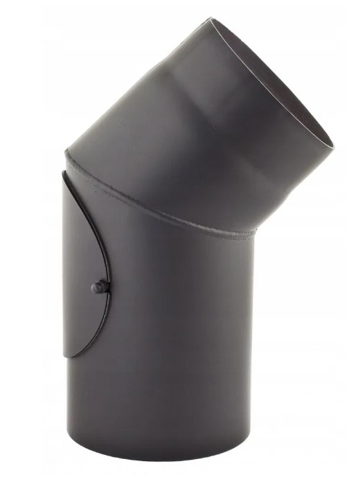 Двухсекционное дымоходное колено с ревизией для поворота на 45° из низколегированной стали Darco окрашено термостойкой краской Senotherm. Плазменная сварка. Толщина черной листовой стали 2 мм.