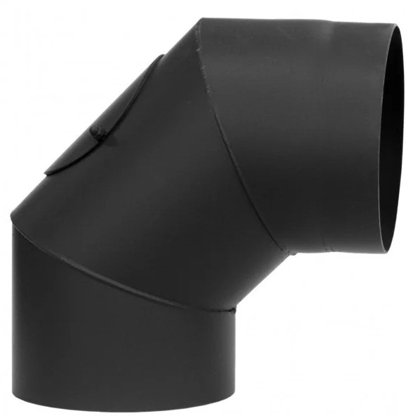 Двухсекционное дымоходное колено с ревизией для поворота на 90° из низколегированной стали Darco окрашено термостойкой краской Senotherm. Плазменная сварка. Толщина черной листовой стали 2 мм.