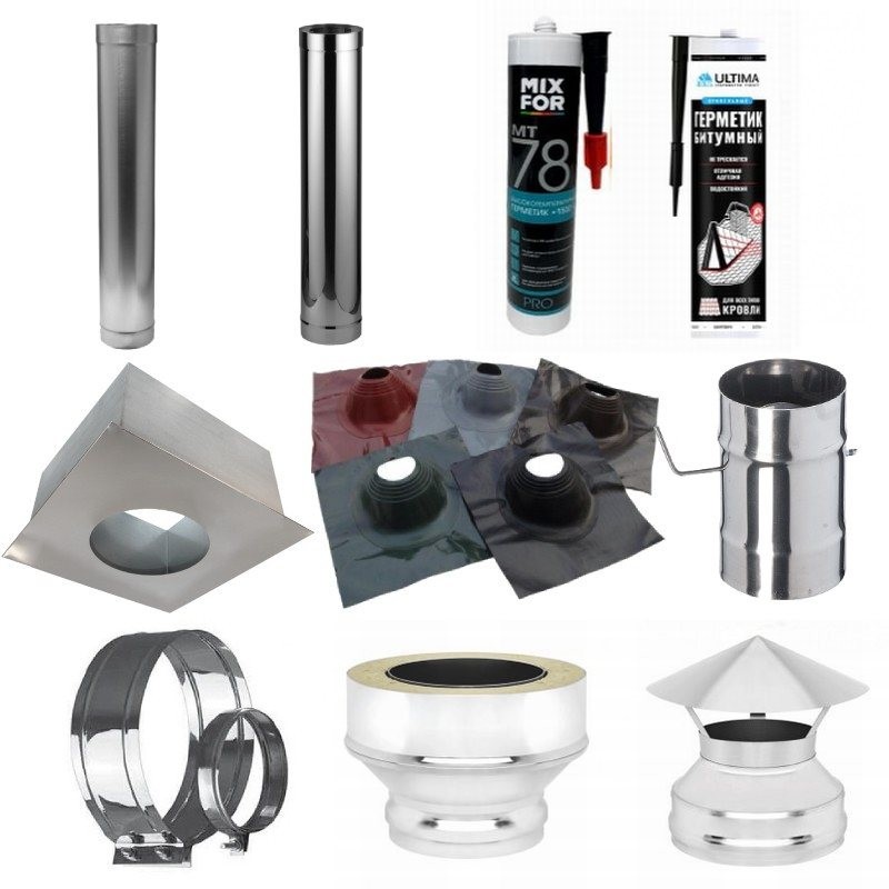 Комплектация: Труба 1м, Сэндвич-Труба 1м, Разделка потолка, Проходник кровли, Битумный герметик, Высокотемпературный герметик, Переход, Хомут, Зонт, Шибер. Для систем вентиляции, воздушного отопления и кондиционирования воздуха.