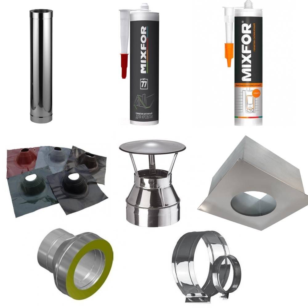 Комплектация: Сэндвич 1 м, Зонт-оголовок, Разделка потолка, Проходник кровли, Битумный герметик, Высокотемпературный герметик, Переход, Хомут