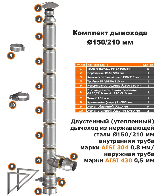 Двустенный утепленный дымоход из нержавеющей стали диаметром 150/210. Внутренняя труба марки AISI 304 диаметром 0,8 мм / наружная марки AISI 430 диаметром 0,5 мм