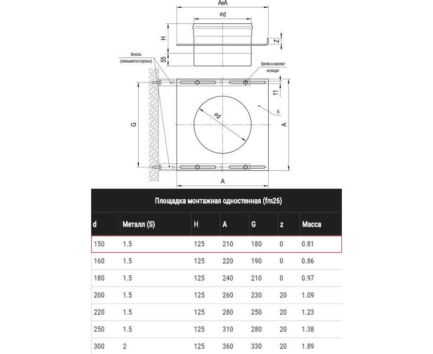 Площадка служит для удержания веса основного неутепленного (одностенного) дымохода и передачи его уже на консоли, опору или подкосы основного крепления, закрепленные на стене.