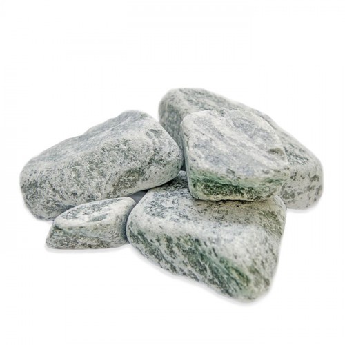 Камни для печей змеевик (серпентинит) обвалованный - обладает высокой теплоемкостью (долго держит и равномерно отдает тепло). Хорошо выдерживает температурные перепады, устойчив к растрескиванию. Камень серо-зеленого цвета различной формы с закругленными краями. Закругленные края позволяют воде легко проникать в глубь каменки к более нагретым камням.