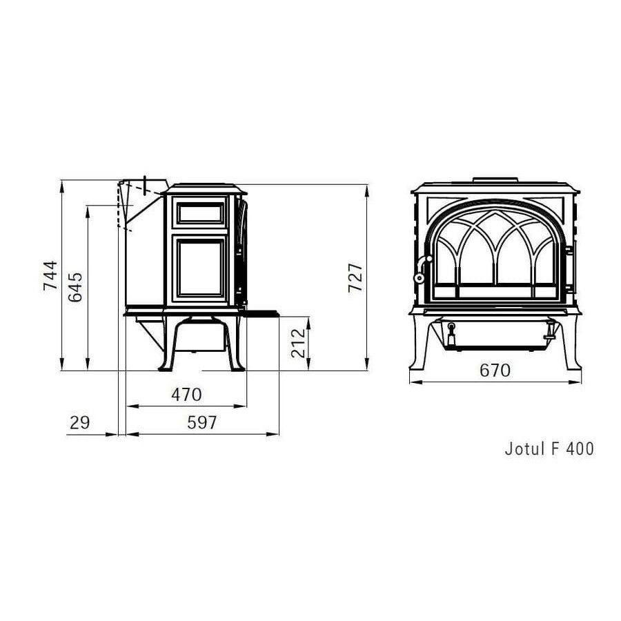 Jotul F 400 BP ― большая чугунный печь камин, максимальная мощность больше 10 кВт. Есть возможность закладки дров длиной до 50 см. Очень большое, а главное чистое благодаря системе омывания потоком воздуха стекло, открывает прекрасный вид на пламя. Печь оснащена зольным ящиком с подключением подачи воздуха из вне, чтобы не выжигать кислород из помещения. Также в Jotul F 400 есть система вторичного дожига газов (CB - Clean Burn), которая увеличивает КПД и сокращает выбросы СО в атмосферу. Также на увеличение эффективности, времени горения и теплоотдачи положительно сказывается наличие шамотной футеровки на задней стенке топочной камеры. Модель изготавливается в двух цветах: