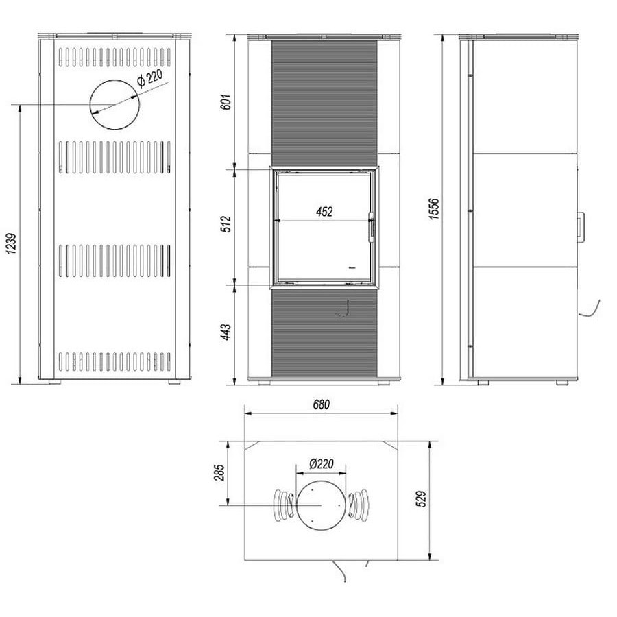 Топка оснащена термостойкой керамикой, выдерживающей температуру до 800°C. Блок соответствует требованиям стандартов Ecodesign и ограничениям стандарта BImSchV 2, который определяет максимальную эмиссию СО. Подовое горение (без колосника) способствует лучшему сгоранию топлива. Благодаря такому типу горения, тепло, выделяемое из древесины, максимизируется. Печь имеет регулируемые ножки и вращающийся на 360° патрубок дымохода.