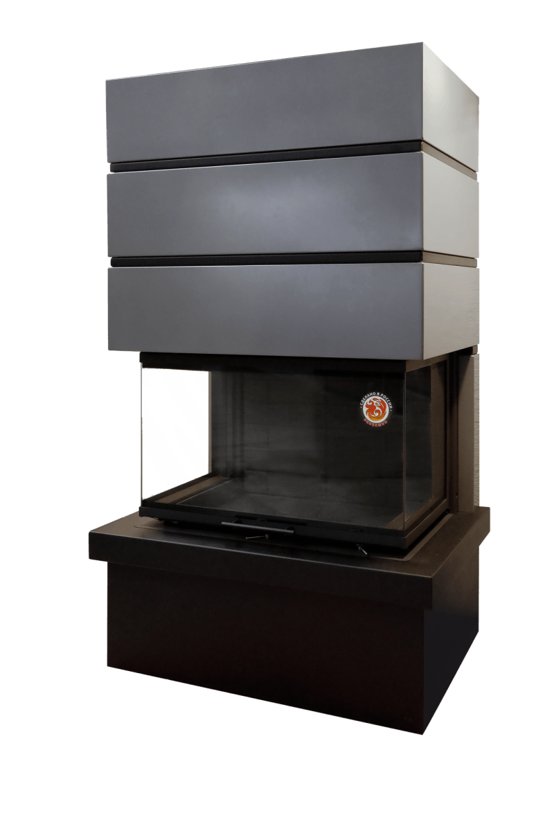 Стильный камин из стали Родос, топка изготовлена из стали с футеровкой из чёрного литьевого шамота, отапливает помещение площадью от 65 до 150 м2. Режим длительного горения до 6 часов. Стекло имеет П-образную форму, что позволяет наблюдать за огнем практически с любого места в комнате.