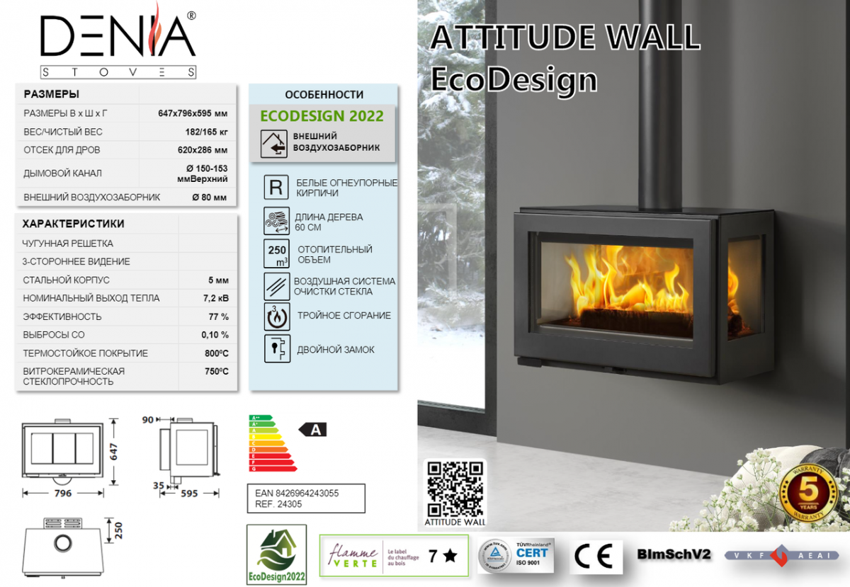 Настенный камин Denia Attitude Wall, мощность 7,2 кВт, отапливаемый объем 250 м3, длина дров 60 см