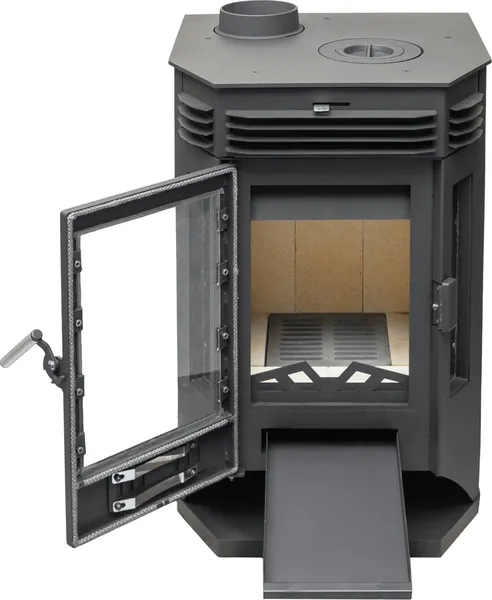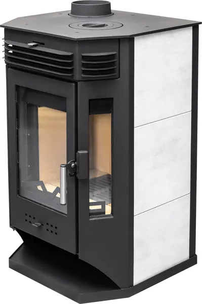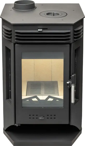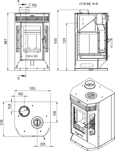 Печь оснащена системой «чистое стекло», которая поддерживает обзор огня без загрязнений, и системой «длительное горение», обеспечивающей экономичный расход топлива и продолжительное тепло. Диаметр патрубка дымохода — 150 мм.
