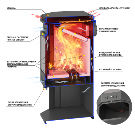 На задней стенке топочной камеры расположен канал для подачи воздуха на вторичный дожиг. П-образный профиль из нержавеющей стали толщиной 2 мм проходит из поддувала в верхнюю часть топки.