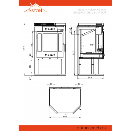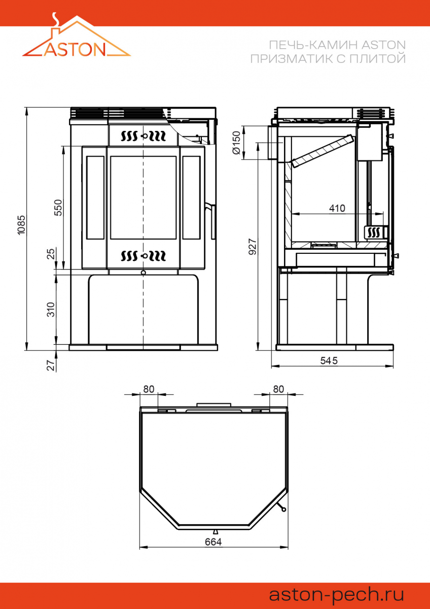 Печь-камин ASTON 12 кВт (200 м3) Призматик с плитой изготовлена из особо прочной котловой стали марки 09Г2С. Наиболее термонагруженные участки выполнены из нержавеющей стали марки AISI 430. Печь работает на дровах и рассчитана на пристенное размещение. Номинальная мощность печи – 12 кВт, что позволяет отапливать помещение объёмом до 200 м³.