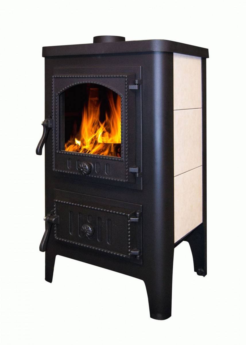 Печь представляет собой стальную печь с чугунными вставками в области дверцы зольника, варочной поверхности, дверцы топки. Облицовка камина из керамической плитки нежного бежевого оттенка делает ее универсальной для любого помещения до 55 кв. м. Внутри стенки выполнены из шамотного кирпича, который при необходимости можно самостоятельно заменить.